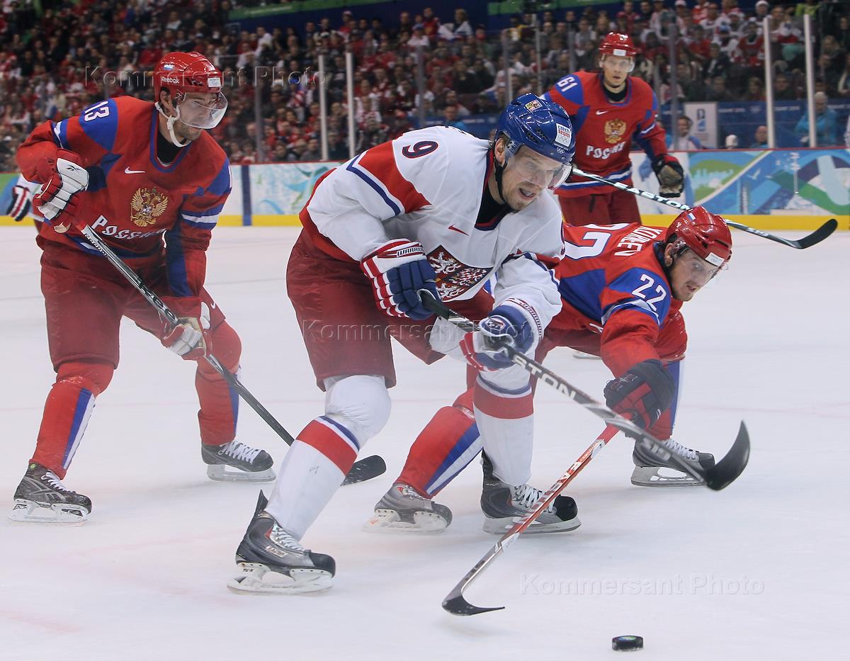 XXI Зимние Олимпийские игры в Ванкувере. Хоккейный матч между сборными командами России и Чехии. Чешский хоккеист Яромир Ягр (второй справа) во время матча.