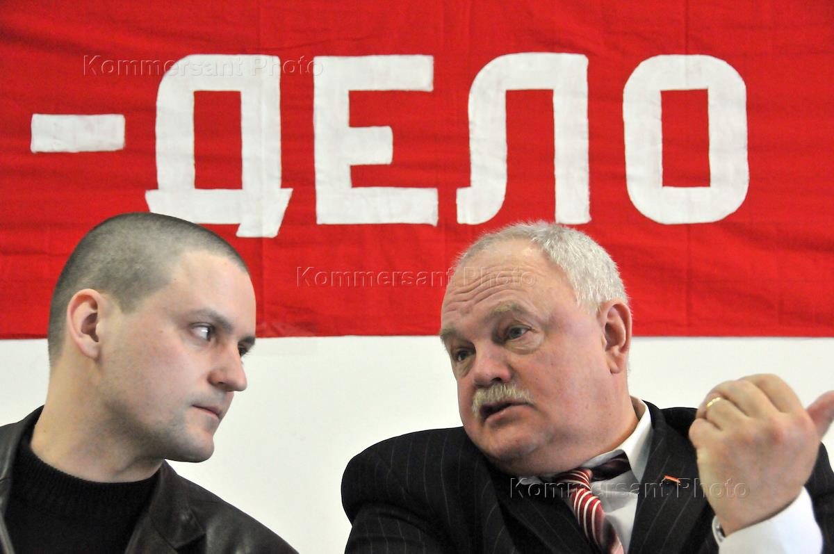 Лидер движения Авангард коммунистической молодежи (АКМ) Сергей Удальцов (слева) и первый секретарь Российской коммунистической рабочей партии (РКРП) Виктор Тюлькин (справа) на учредительном съезде политической партии "Российский объединенный трудовой Фронт" в гостинице "Измайлово".