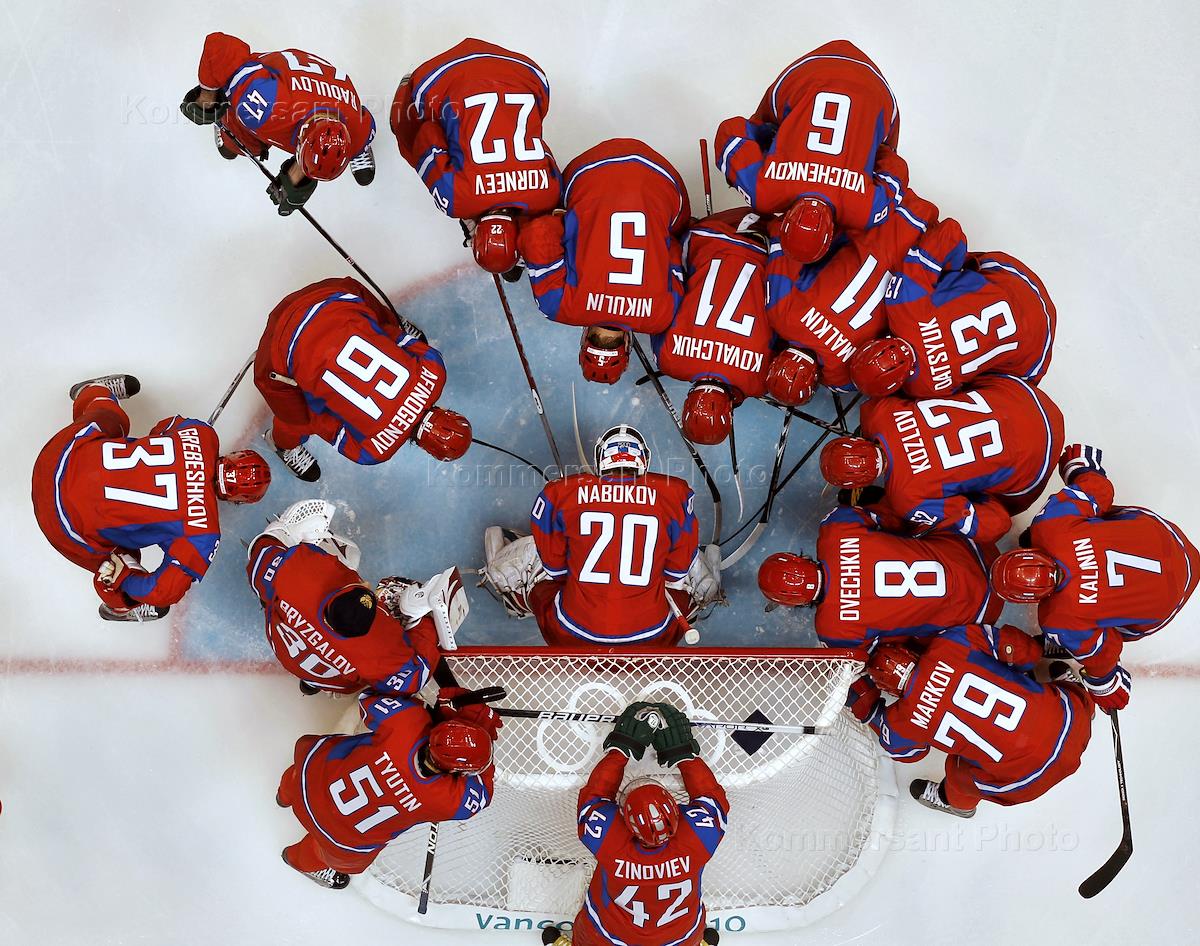 XXI Зимние Олимпийские игры в Ванкувере. Хоккейный матч 1/4 финала между сборными камандами России и Канады. Сборная России перед началом матча у своих ворот.