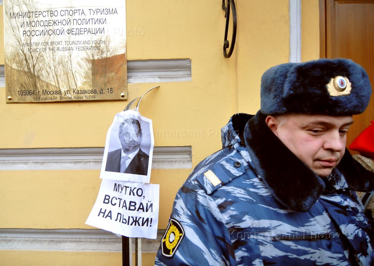 Акция, организованная движением "Левый фронт", с требованием отставки министра спорта, туризма и молодежной политики России Виталия Мутко и президента Олимпийского комитета России Леонида Тягачева в связи с неудачным выступлением российской сборной на XXI Зимней Олимпиаде в Ванкувере. Акция прошла у здания Министерства спорта, туризма и молодежной политики России.
