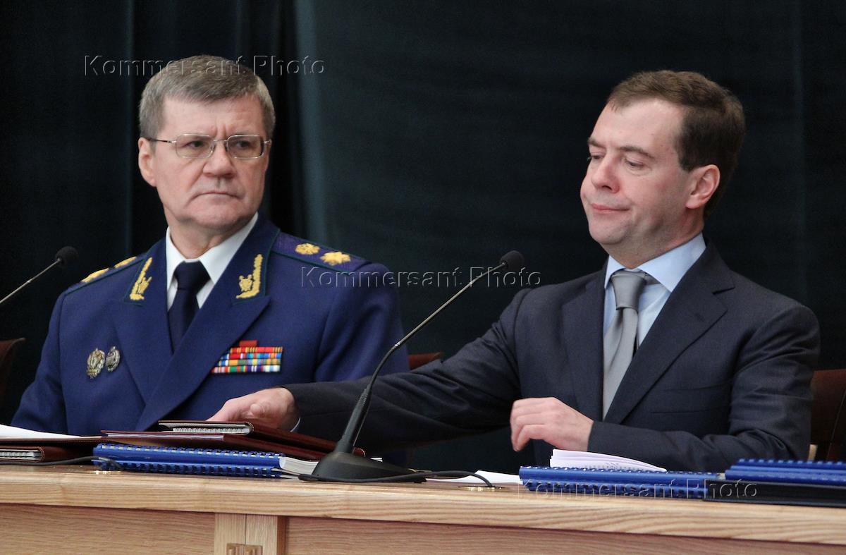 Генеральный прокурор России Юрий Чайка (слева) и президент России Дмитрий Медведев (справа) на расширенном заседании коллегии Генеральной прокуратуры России.
