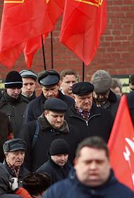 Лидер Коммунистической партии России (КПРФ) Геннадий Зюганов (второй слева), его заместитель Иван Мельников (в центре), секретарь ЦК КПРФ Владимир Кашин (второй справа) и первый секретарь Московского городского комитета (МГК) КПРФ Владимир Улас (справа) у мавзолея Владимира Ленина во время церемонии возложения цветов к могиле Иосифа Сталина у Кремлевской стены в годовщину его смерти. Церемония организована КПРФ.