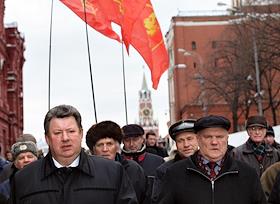 Пресс-секретарь Геннадий Зюганова Александр Ющенко (второй слева), лидер Коммунистической партии России (КПРФ) Геннадий Зюганов (в центре) и секретарь ЦК КПРФ Владимир Кашин (справа) на церемонии возложения цветов к могиле Иосифа Сталина у Кремлевской стены в годовщину его смерти. Церемония организована КПРФ.