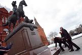 Лидер Коммунистической партии России (КПРФ) Геннадий Зюганов (слева), его заместитель Иван Мельников (справа) у памятника маршалу Георгию Жукову после церемонии возложения цветов к могиле Иосифа Сталина у Кремлевской стены в годовщину его смерти. Церемония организована КПРФ.