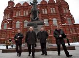 Лидер Коммунистической партии России (КПРФ) Геннадий Зюганов (второй слева), его заместитель Иван Мельников (слева) и секретарь ЦК КПРФ Владимир Кашин (второй справа) у памятника маршалу Георгию Жукову после церемонии возложения цветов к могиле Иосифа Сталина у Кремлевской стены в годовщину его смерти. Церемония организована КПРФ.