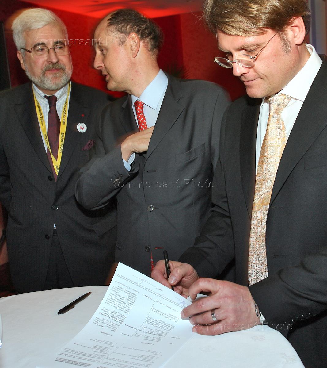 Слева направо: посол Франции в России Жан де Глиниасти, директор по управлению Accor Group в России Алексис Деларофф и директор по управлению отелями компании Accor Hospitality Руслан Глянцев на XXI международной выставке недвижимости "MIPIM 2010" (МИПИМ).