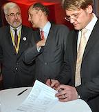 Слева направо: заместитель городского головы Калуги - начальник управления архитектуры, градостроительства и земельных отношений Александр Филиппов, директор по управлению Accor Group в России Алексис Деларофф, директор по управлению отелями компании Accor Hospitality Руслан Глянцев и заместитель губернатора Калужской области Владимир Потемкин на XXI международной выставке недвижимости "MIPIM 2010" (МИПИМ).