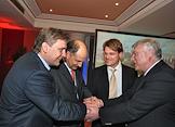 XXI международная выставка недвижимости "MIPIM 2010" (МИПИМ). Директор компании "ЖСО-Сервис" Жиль Себии (слева), заместитель губернатора Калужской области Владимир Потемкин (второй слева) и посол Франции в России Жан де Глиниасти (вторй справа) на коктейле от губернатора Калужской области в отеле Martinez.