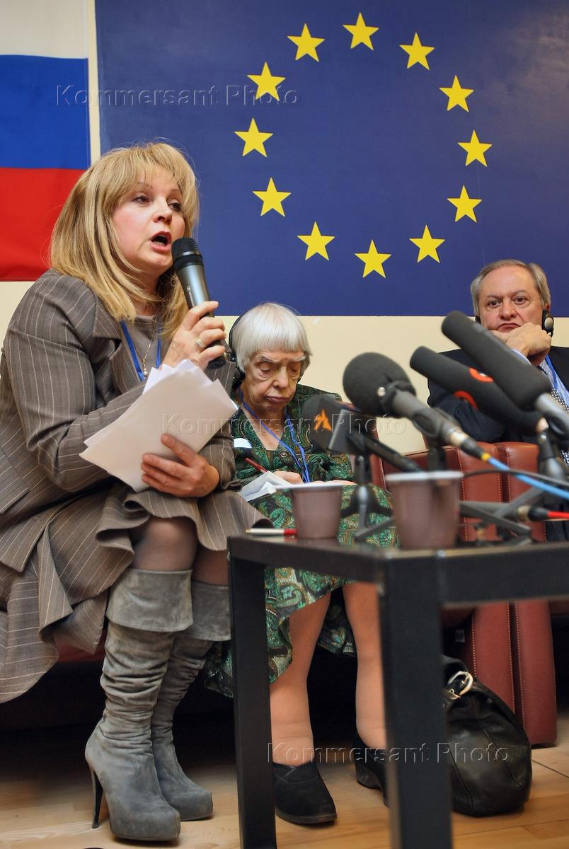 Слева направо: председатель Совета при президенте России по содействию развитию институтов гражданского общества и правам человека, председатель президиума Общероссийского общественного движения "Гражданское достоинство" Элла Памфилова, глава представительства Европейской союза в России посол Фернандо Валенсуэлло и председатель Московской Хельсинкской группы Людмила Алексеева на ежегодной конференции по правам человека, организованной представительством Европейского Союза в Москве.