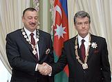 Президент Азербайджана Ильхам Алиев (слева) во время церемонии награждения бывшего президента Украины Виктора Ющенко (справа) орденом Гейдара Алиева.