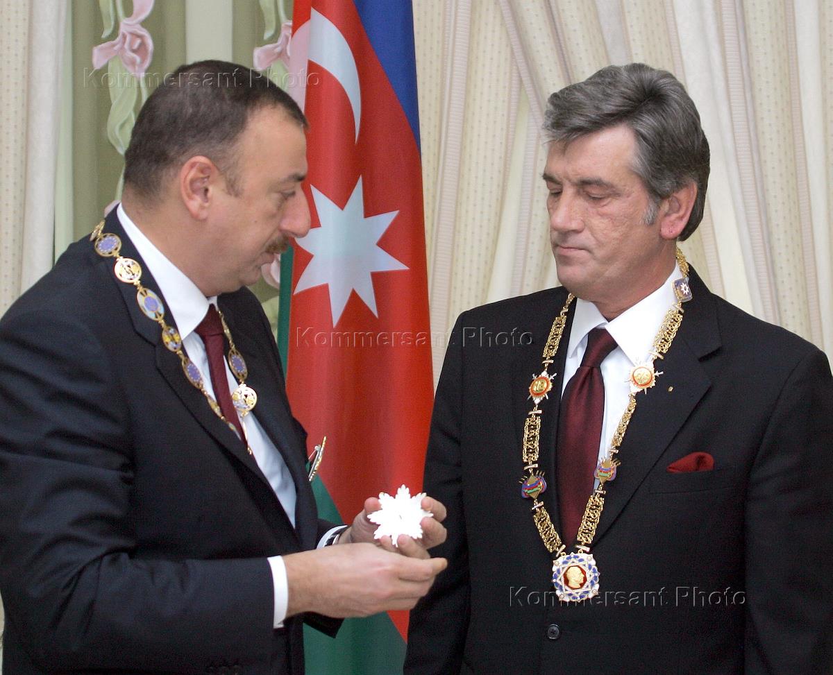 Президент Азербайджана Ильхам Алиев (слева) во время церемонии награждения бывшего президента Украины Виктора Ющенко (справа) орденом Гейдара Алиева.