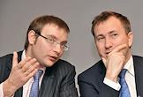 Председатель правления ОАО "Фондовая бржа РТС" Роман Горюнов (слева) и председатель правления Национальной Ассоциации Участников Фондового Рынка (НАУФОР) Алексей Тимофеев (справа) на I международной конференции "Иностранные ценные бумаги в России: размещение, обращение и инвестирование" в Центре международной торговли.