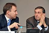 Руководитель Федеральной службы по финансовым рынкам (ФСФР) Владимир Миловидов (слева) и президент Национальной лиги управляющих Дмитрий Александров (справа) на I международной конференции "Иностранные ценные бумаги в России: размещение, обращение и инвестирование" в Центре международной торговли.