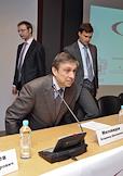 Председатель правления ОАО "Фондовая бржа РТС" Роман Горюнов (слева), руководитель Федеральной службы по финансовым рынкам (ФСФР) Владимир Миловидов (в центре) и президент Национальной лиги управляющих Дмитрий Александров (справа) на I международной конференции "Иностранные ценные бумаги в России: размещение, обращение и инвестирование" в Центре международной торговли.