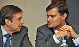 Председатель правления Национальной Ассоциации Участников Фондового Рынка (НАУФОР) Алексей Тимофеев (слева) и руководитель Федеральной службы по финансовым рынкам (ФСФР) Владимир Миловидов (справа) на I международной конференции "Иностранные ценные бумаги в России: размещение, обращение и инвестирование" в Центре международной торговли.
