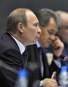 Председатель правительства России Владимир Путин (слева) и министр России по делам гражданской обороны, чрезвычайным ситуациям и ликвидации последствий стихийных бедствий Сергей Шойгу (второй слева) на расширенном заседании Правительственной комиссии по предупреждению и ликвидации чрезвычайных ситуаций и обеспечению пожарной безопасности. Заседание прошло в Главном управлении МЧС России.
