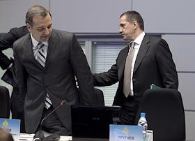 Статс-секретарь - заместитель министра России по делам гражданской обороны, чрезвычайным ситуациям и ликвидации последствий стихийных бедствий Владимир Пучков (слева) и министр природных ресурсов и экологии России Юрий Трутнев (справа) на расширенном заседании Правительственной комиссии по предупреждению и ликвидации чрезвычайных ситуаций и обеспечению пожарной безопасности. Заседание прошло в Главном управлении МЧС России.