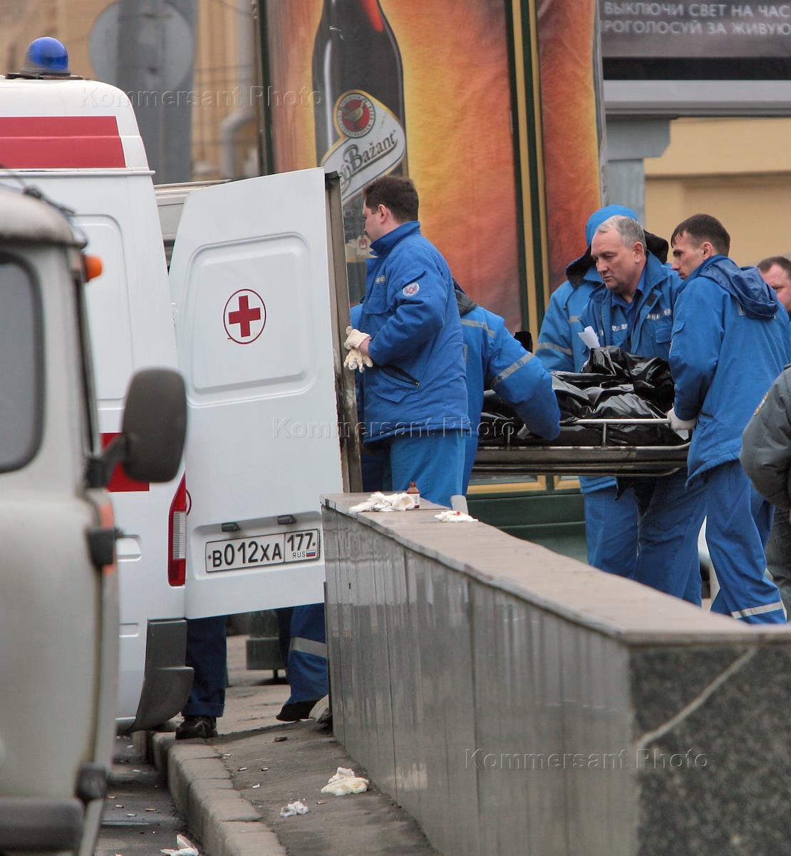 Последствия взрыва на станции метро "Лубянка". Сотрудники скорой помощи выносят тела погибших при взрыве.
