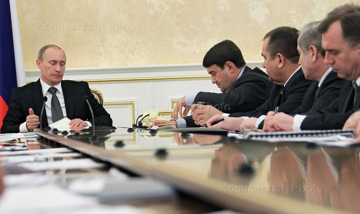 Председатель правительства России Владимир Путин (справа) и заместитель председателя правительства России Алексей Кудрин (второй справа) на совещании по вопросам обеспечения безопасности на транспорте, в Доме правительства.