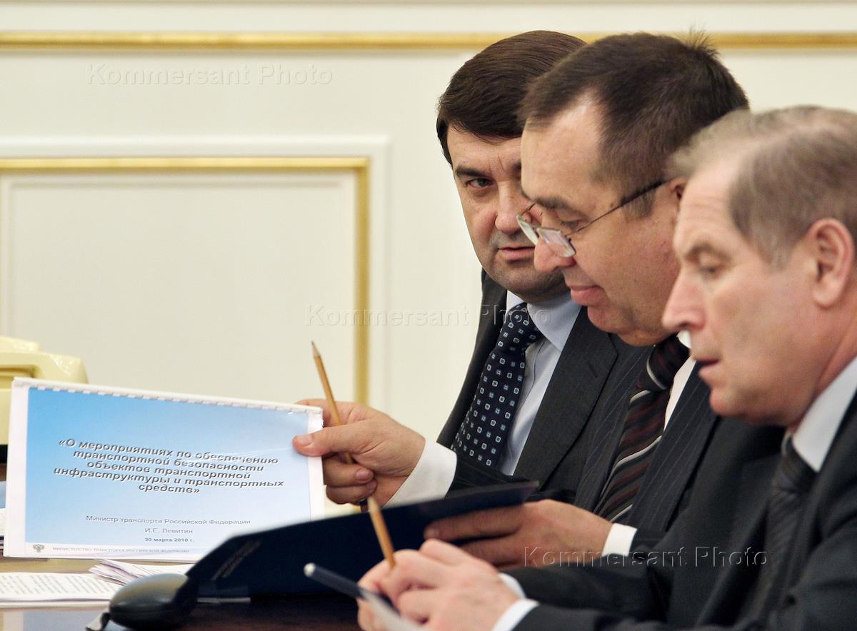 Министр транспорта России Игорь Левитин (слева) на совещании по вопросам обеспечения безопасности на транспорте. Совещание прошло в Доме правительства.