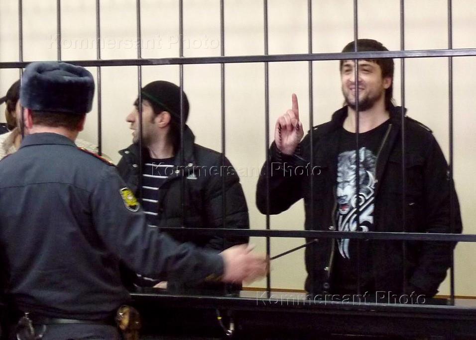 Обвиняемые в совершении убийства двух человек в кондопожском ресторане "Чайка" Герихан Магомадов (слева) и Ислам Магомадов (в центре) во время заседания Верховного суда Карелии.