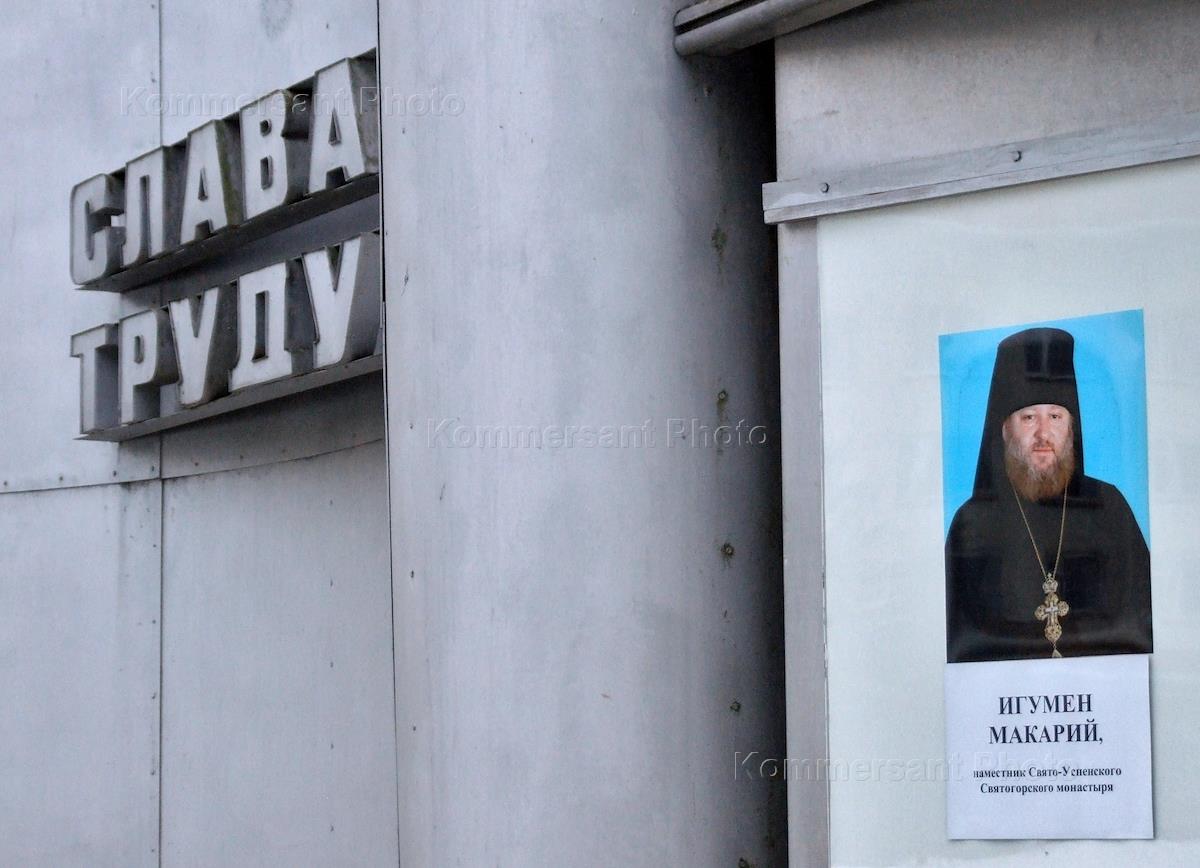 Жанровая фотография. Советский лозунг "Слава Труду" и портрет Игумена Макария.
