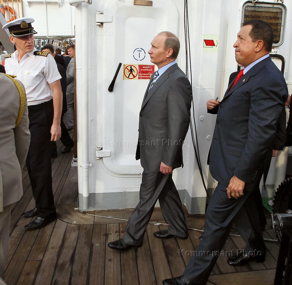 Venezuelan Hugo Chavez (right) and Russian Prime Minister Vladimir Putin (center) on board the Russian sailing ship Kruzenshtern in Caracas.