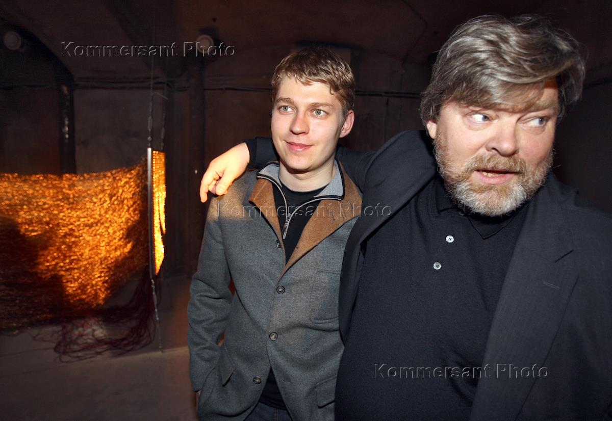 Owner and editor-in-chief of "Independent newspaper" Konstantin Remchukov, right, with son Nikolay at a party devoted to the opening of exhibition Lexus Hybrid Art in art centre "Vetoshny".