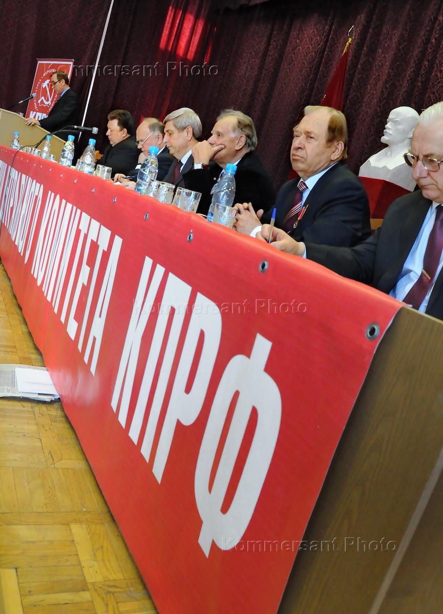 Слева направо сидят за столом: секретарь ЦК КПРФ Владимир Кашин, лидер Коммунистической партии России (КПРФ) Геннадий Зюганов, первый заместитель председателя КПРФ Иван Мельников, вице-президент Российской академии наук (РАН), нобелевский лауреат Жорес Алферов, члены фракции КПРФ в Государственной думе России Василий Стародубцев и Петр Романов на V совместном Пленуме Центрального комитета (ЦК) Коммунистической партии России (КПРФ) и Центральной контрольно-ревизионной комиссии (ЦКРК) КПРФ. Пленум прошел в поселке "Московский".