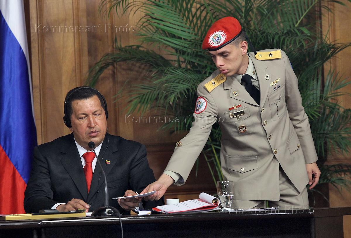 Президент Венесуэлы Уго Чавес (справа) во время пресс-конференции по итогам переговоров в Каракасе вручил председателю правительства России Владимиру Путину (в центре) Орден Либертадора (Освободителя).