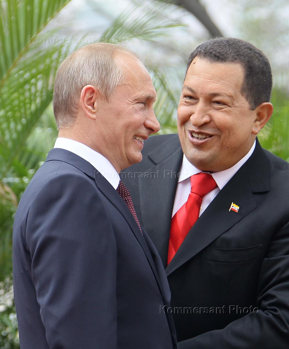 Президент Венесуэлы Уго Чавес (справа) на церемонии встречи председателя правительства России Владимира Путина, прибывшего с официальным визитом в Каракас.