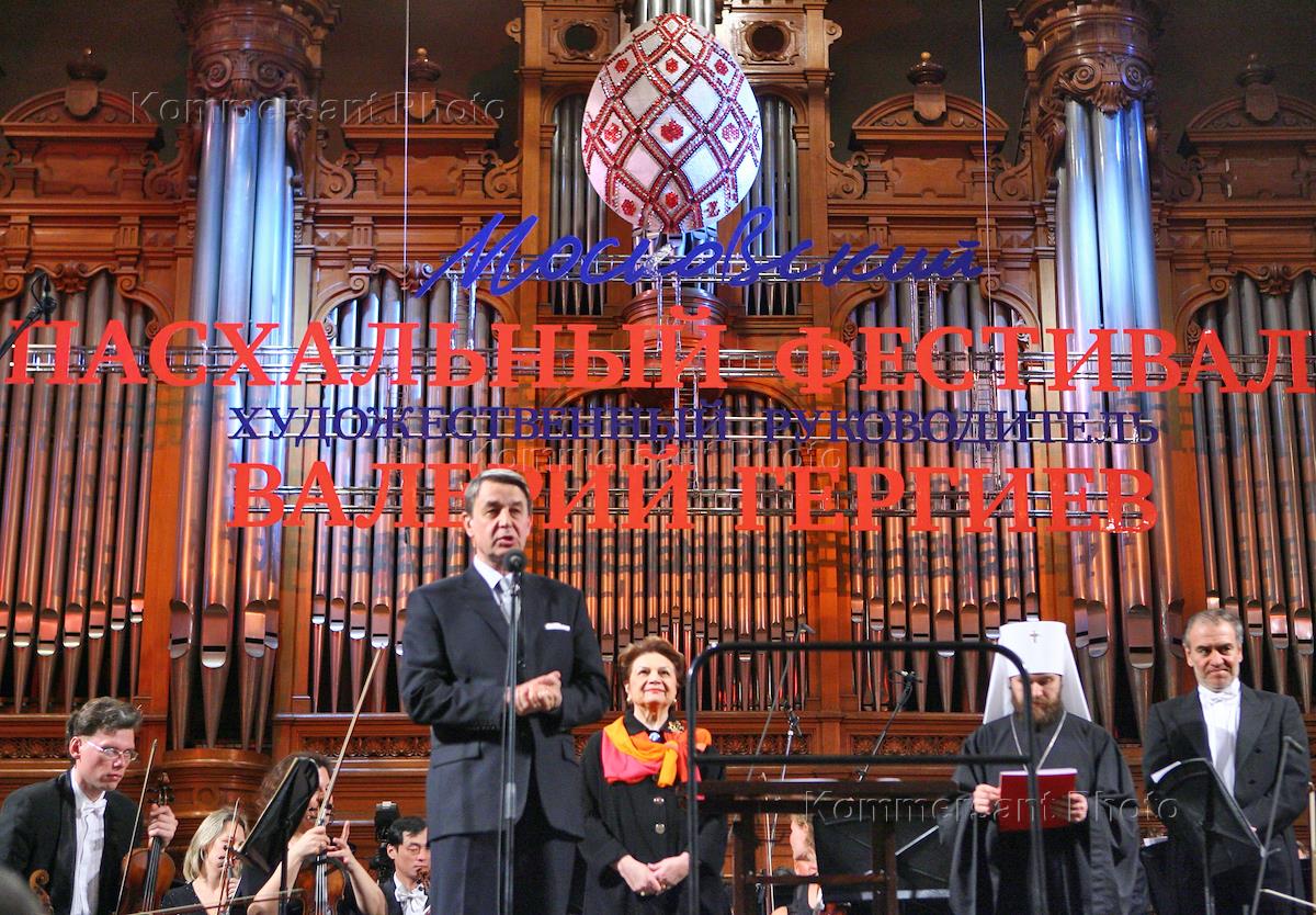 Слева направо: министр культуры России Александр Авдеев, первый заместитель премьера правительства Москвы, руководитель Комплекса социальной сферы Людмила Швецова, председатель отдела внешних церковных связей Московского Патриархата митрополит Волоколамский Иларион и художественный руководитель Мариинского театра, дирижер Валерий Гергиев на церемонии открытия IX Московского пасхального фестиваля в Большом зале Московской консерватории.