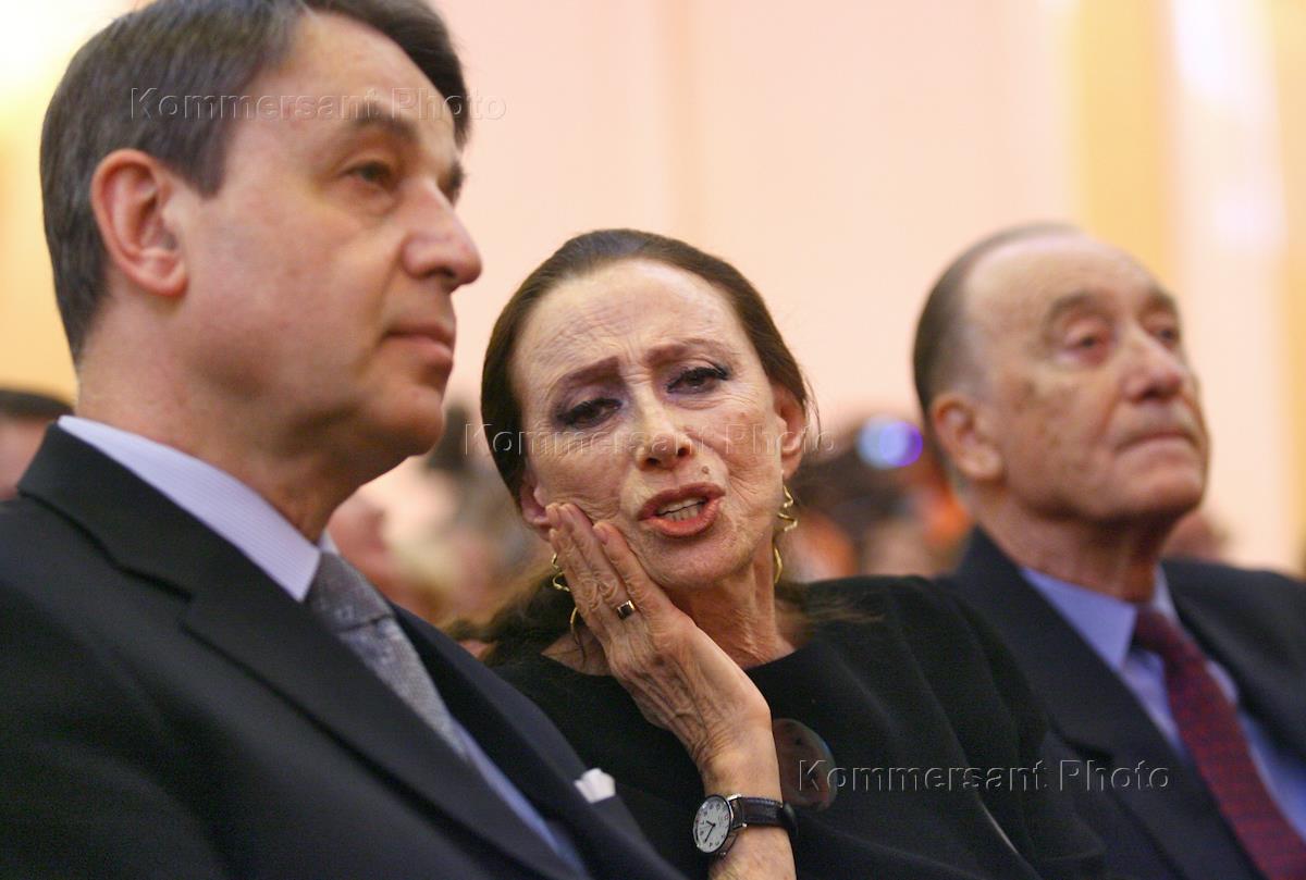 Слева направо: министр культуры России Александр Авдеев, балерина Майа Плисецкая и композитор Родион Щедрин на открытии Московского Пасхального фестиваля, в Большом зале Консерватории.