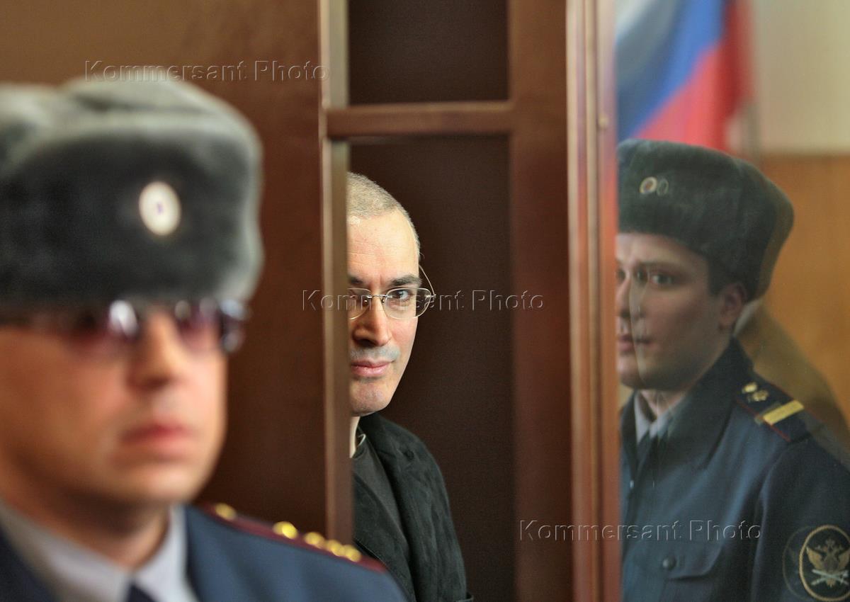 Former Yukos head Mikhail Khodorkovsky (center), who is accused of embezzling 350 million tons of oil, before a hearing of the Khamovnichesky Court, where his case is being heard.