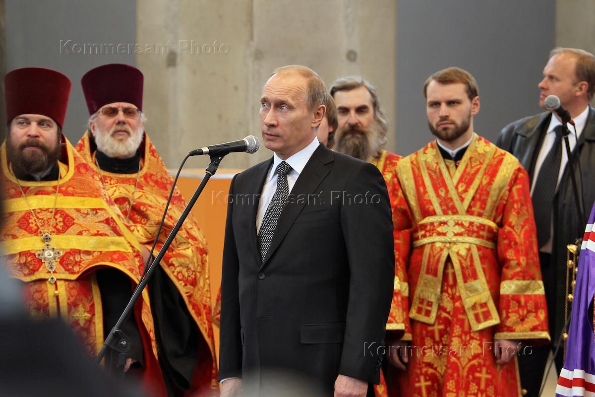 Russian Prime Minister Vladimir Putin (center) at the ceremonial laying of the cornerstone of the Cathedral of the Resurrection at the Katyn memorial complex.