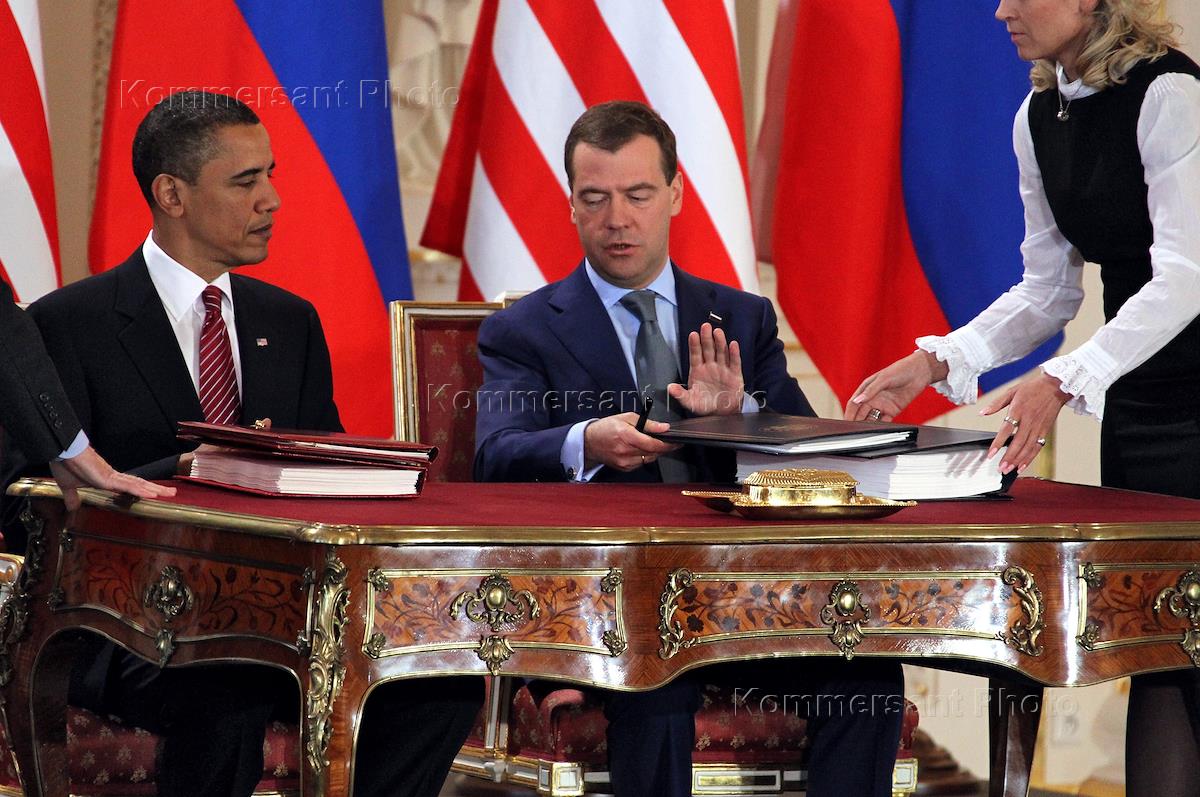 Президент США Барак Обама (слева) и президент России Дмитрий Медведев (справа) во время церемонии подписания "Договора о мерах по дальнейшему сокращению и ограничению стратегических наступательных вооружений (СНВ)". Церемония прошла в Испанском зале резиденции президента Чехии в Пражском Граде.