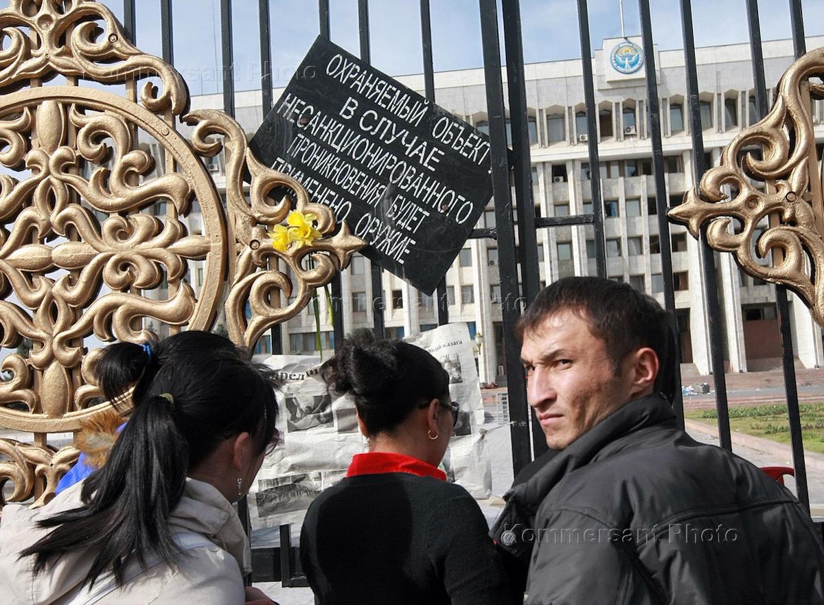 Последствия массовых беспорядков в Бишкеке. Табличка "Охраняемый объект. В случае несанкционированного проникновения будет применено оружие!" на ограде Дома правительства Киргизии.
