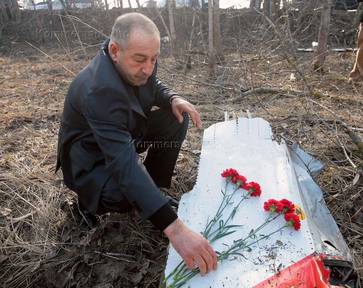 Мужчина кладет цветы на месте авиакатастрофы самолета "Ту-154" президента Польши Леха Качиньского, потерпевшего крушение 10 апреля 2010 года под Смоленском у военного аэропорта "Северный".
