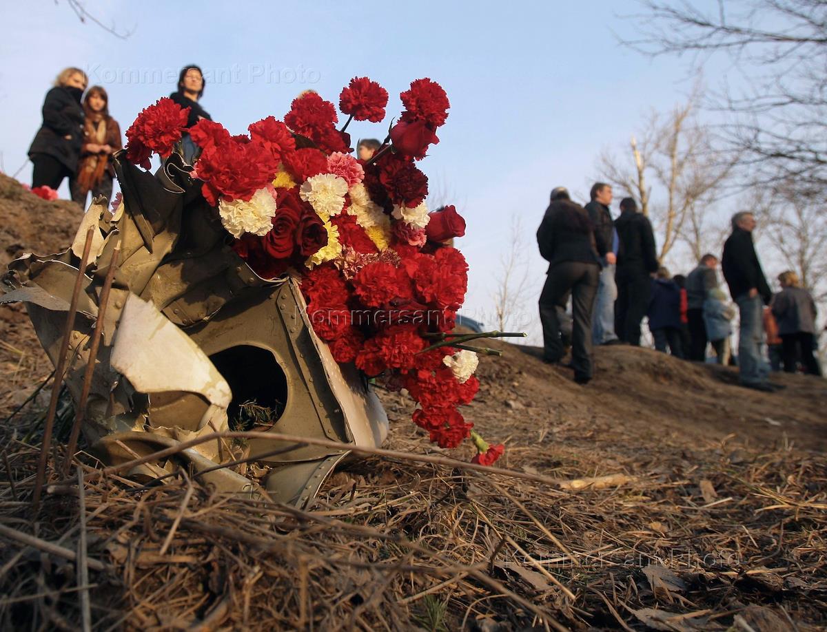 Цветы на месте авиакатастрофы самолета "Ту-154" президента Польши Леха Качиньского, потерпевшего крушение 10 апреля 2010 года под Смоленском у военного аэропорта "Северный".