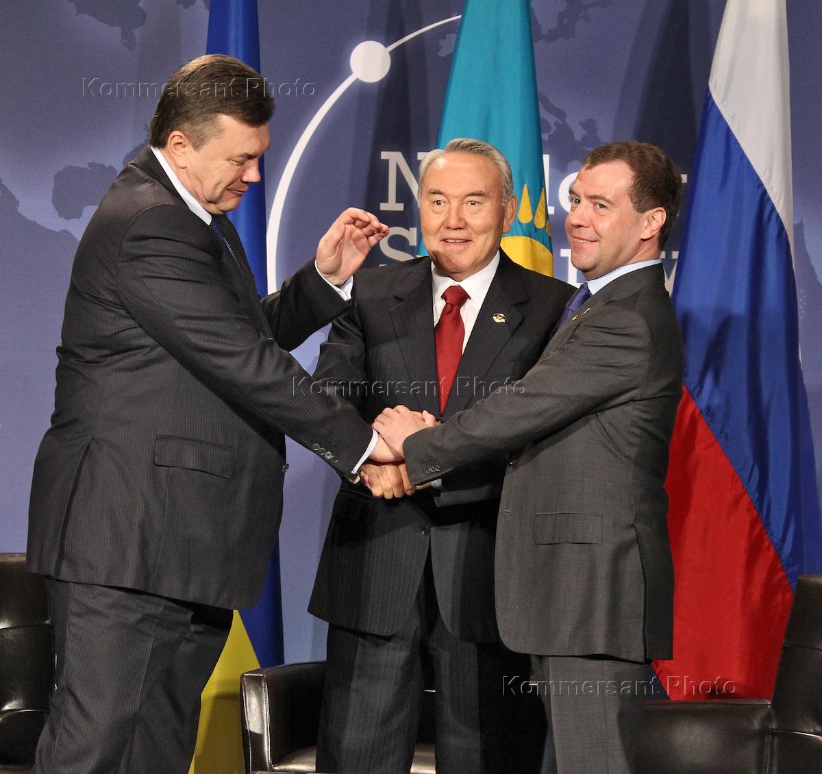 Слева направо: президент Украины Виктор Янукович, президент Казахстана Нурсултан Назарбаев и президент России Дмитрий Медведев во время совместного фотографирования глав государств и правительств - участников саммита в Вашингтоне по вопросам ядерной безопасности.