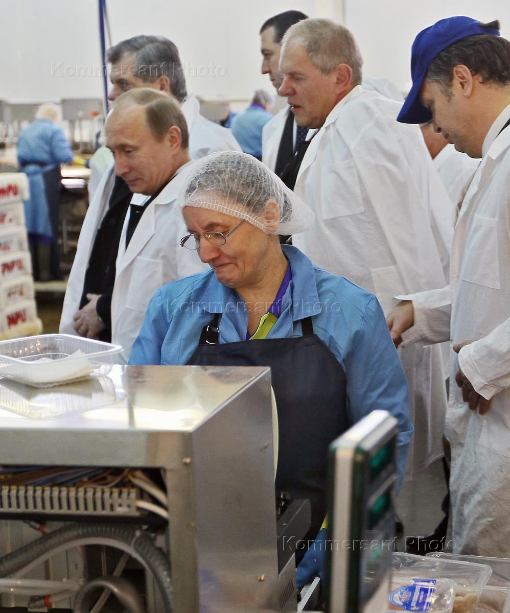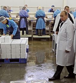Рабочая поездка Председателя правительства России Владимира Путина в Мурманскую область. Председатель правительства России Владимир Путин (справа) на рыбоперерабатывающем предприятии ОАО "Норд-Вест Ф.К.".