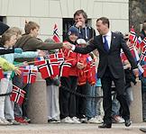 Президент России Дмитрий Медведев (справа) с норвежскими школьниками во время торжественной церемонии официальной встречи на Дворцовой площади у королевского дворца в Осло.