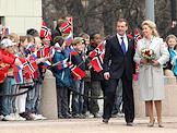 Слева направо: президент России Дмитрий Медведев, супруга президента России Светлана Медведева и король Норвегии Харальд V с норвежскими школьниками во время торжественной церемонии официальной встречи на Дворцовой площади у королевского дворца в Осло.