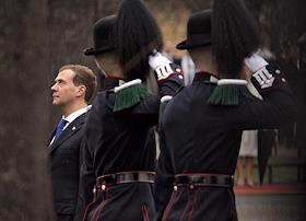 Президент России Дмитрий Медведев (слева) во время церемонии официальной встречи с королем Норвегии Харальдом V.