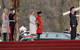 Слева направо: король Норвегии Харальд V, королева Норвегии Соня и крон-принцесса Норвегии Метте-Марит во время торжественной церемонии официальной встречи в королевском дворце в Осло.