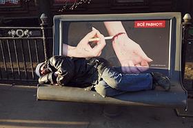 Бездомный человек спит на лавочке с рекламой о вреде курения "Все равно?"