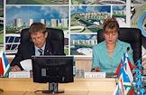 Председатель городской думы Благовещенска Сергей Левицкий (в центре) и исполняющий обязанности мэра Благовещенска Валентина Калита (справа) во время заседания городской думы Благовещенска.