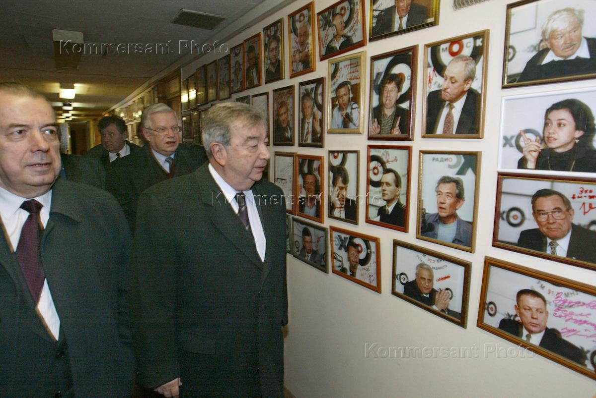 The State Duma 'Fathekland-All Russia' faction leader Yevgeny Primakov (right), Russian Industry and Business Association (RSPP) President Arcady Volsky (second from the left) attend the news conference broadcast live by the Echo of Moscow Radio. The news conference was held to discuss the results of the TV Channel 6 licence tender won by the Media-Socium partnership co-established by Mr Primakov.