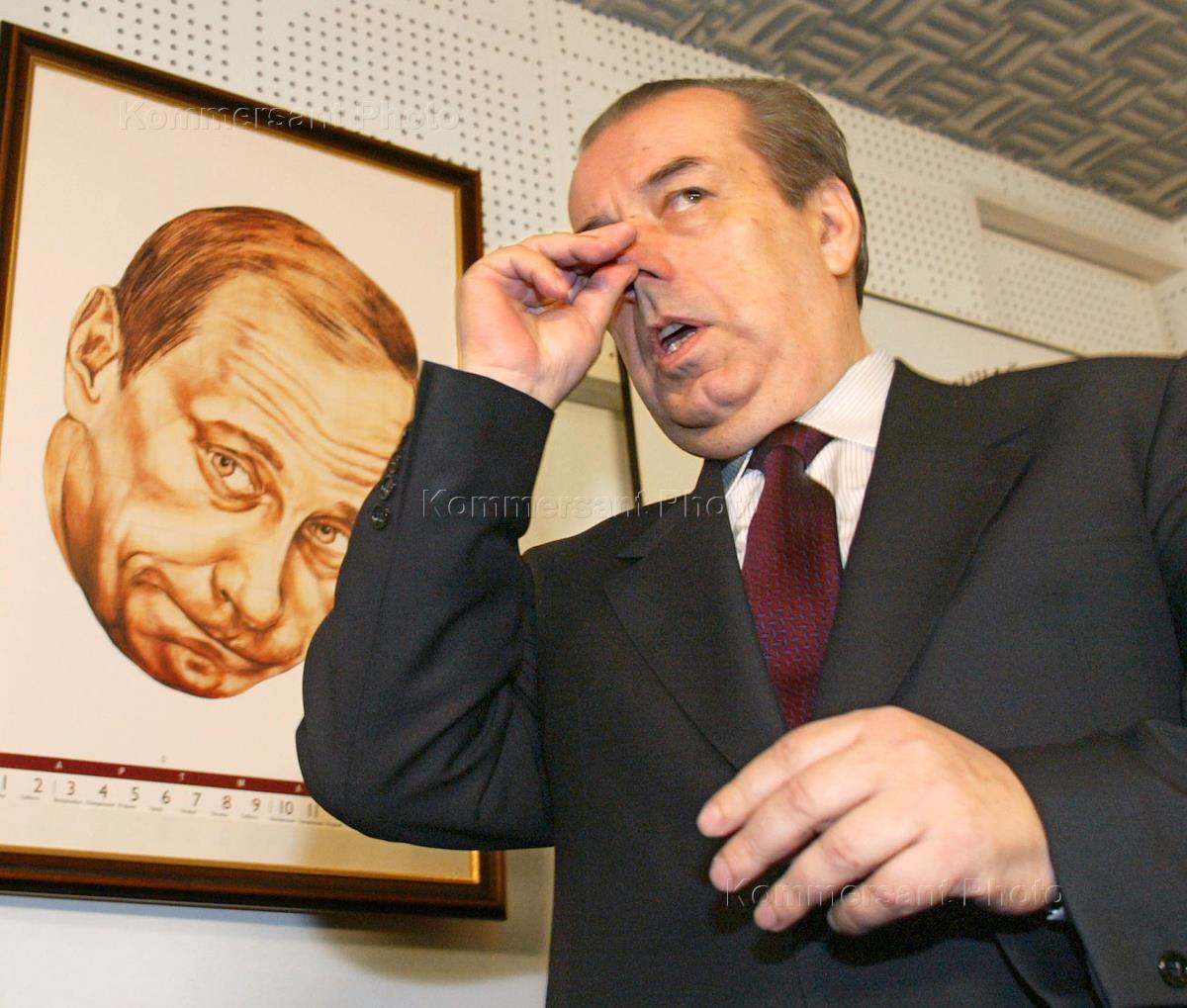 The State Duma 'Fathekland-All Russia' faction leader Yevgeny Primakov (right), Russian Industry and Business Association (RSPP) President Arcady Volsky (left) attend the news conference broadcast live by the Echo of Moscow Radio. The news conference was held to discuss the results of the TV Channel 6 licence tender won by the Media-Socium partnership co-established by Mr Primakov.
