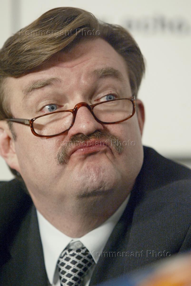 The State Duma 'Fathekland-All Russia' faction leader Yevgeny Primakov (right), Russian Industry and Business Association (RSPP) President Arcady Volsky (left) attend the news conference broadcast live by the Echo of Moscow Radio. The news conference was held to discuss the results of the TV Channel 6 licence tender won by the Media-Socium partnership co-established by Mr Primakov.
